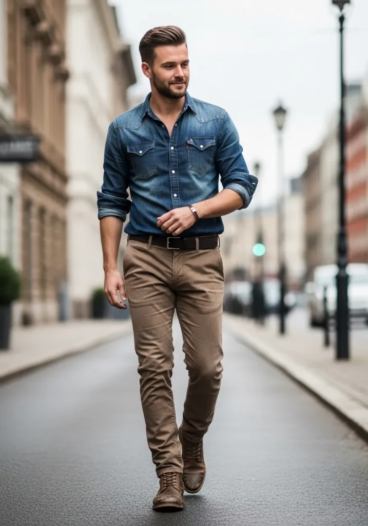 This outfit pairs slim brown chinos with a fitted dark denim button down shirt, sleeves casually rolled for a relaxed finish. The structured denim adds texture and a slightly rugged edge, while the tailored chinos keep the silhouette clean and refined. A dark leather belt defines the waist, and brown lace up boots complete the look with a sturdy, masculine feel. The mix of blue denim and warm brown tones creates a timeless street ready vibe.