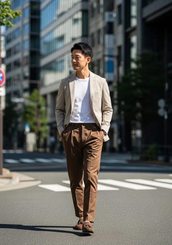 This outfit pairs tailored brown chinos with a crisp white T shirt and a light beige blazer layered on top. The chinos have a clean straight fit with subtle structure through the leg, giving the whole silhouette a refined shape. Brown suede loafers echo the warmth of the trousers and add a polished finish. The soft neutral blazer keeps the look airy and modern, perfect for a sunny day in the city.