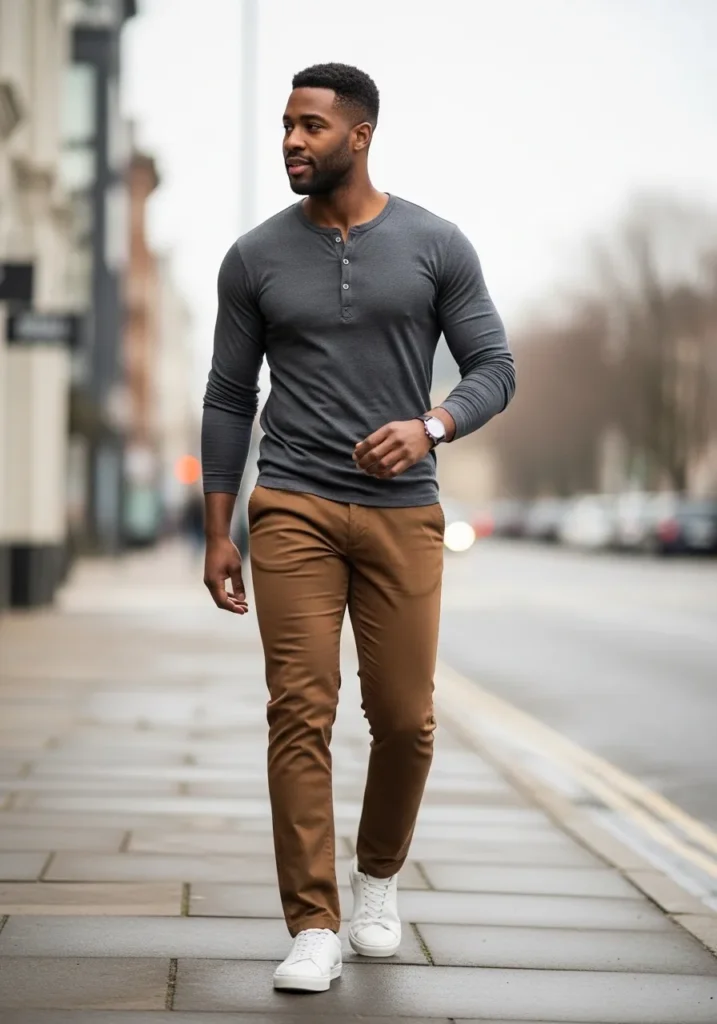 This outfit pairs slim brown chinos with a fitted charcoal long sleeve henley that adds subtle texture and shape. The chinos are tailored and smooth, creating a clean line through the legs. Crisp white sneakers brighten the look and keep it grounded in a relaxed city vibe. The deep gray top against the warm brown trousers feels balanced and masculine without looking heavy.