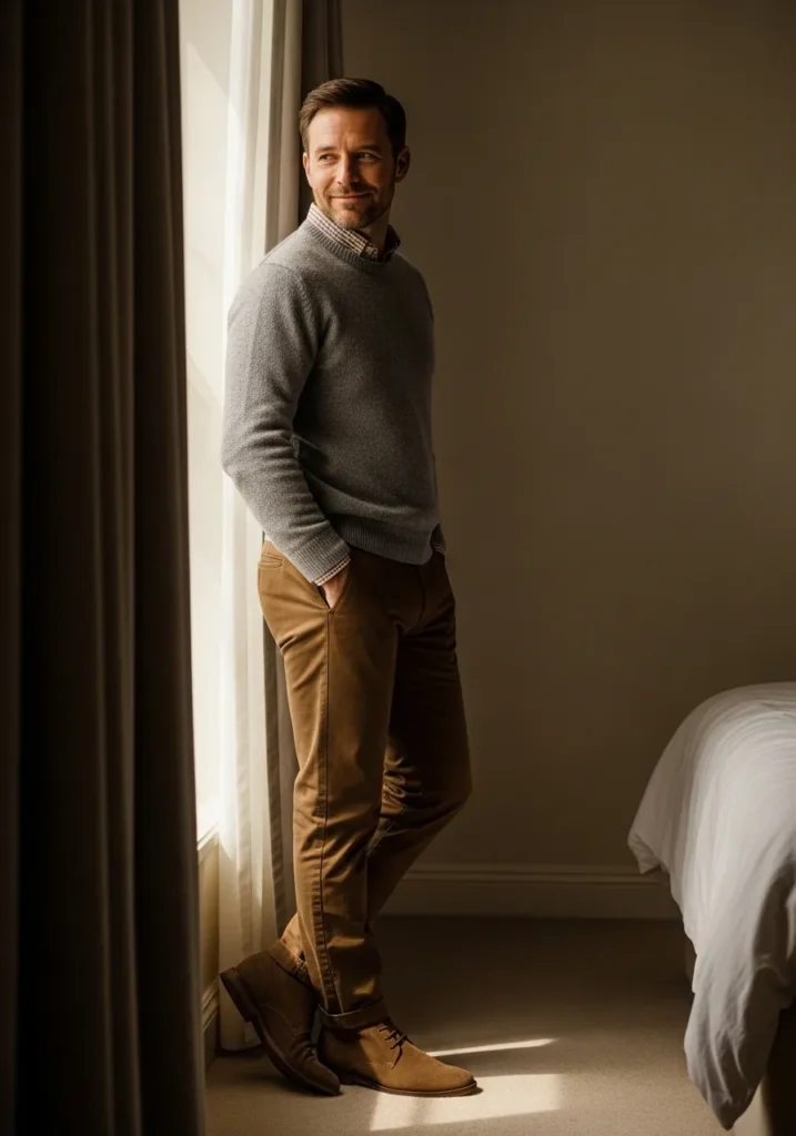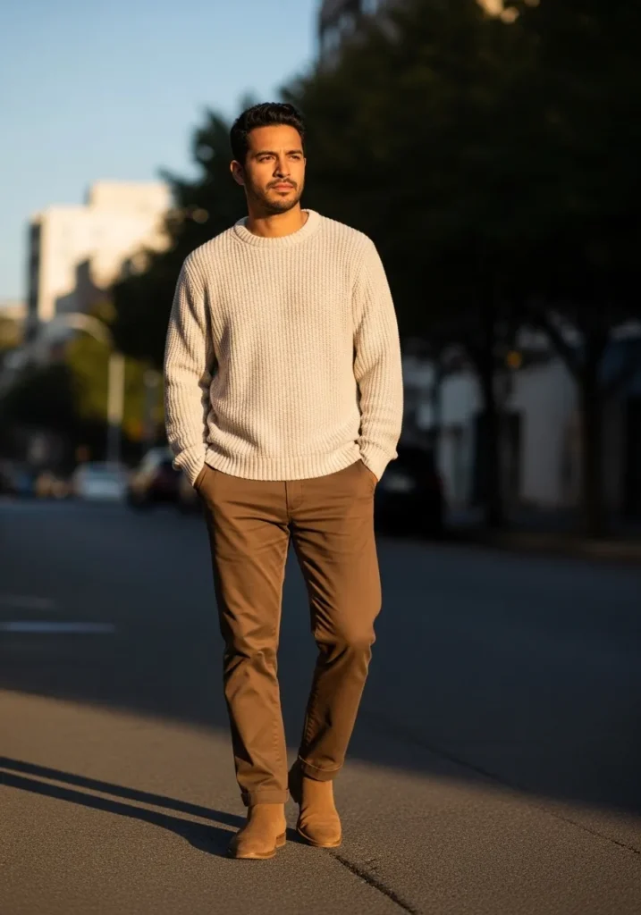 I love how this combination feels both cozy and refined at the same time. The cream knit softens the structure of the chinos, which makes the whole outfit look approachable and stylish without trying too hard. If you are into neutral palettes that always photograph well, this is such a safe and flattering choice. It gives that effortlessly handsome energy that we all secretly appreciate.