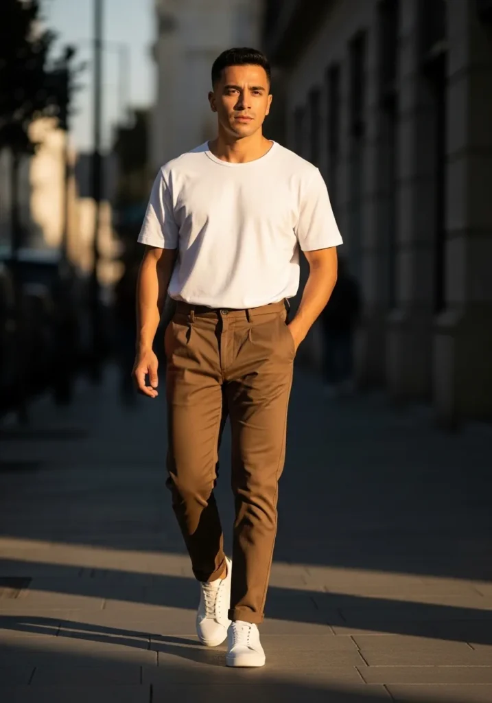 This outfit keeps things clean and modern with tailored brown chinos paired with a crisp white crew neck tee. The tee is neatly tucked in, which highlights the structured waistband and gives the whole look a sharp finish. Slim white sneakers add a fresh contrast and keep the vibe relaxed yet polished. The warm brown tones against the bright white feel balanced and effortlessly stylish in the golden light.