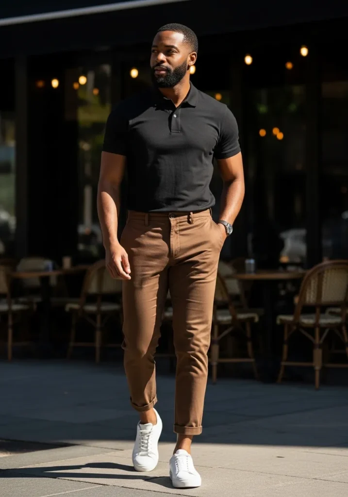 This look pairs tailored brown chinos with a fitted black polo that feels sharp and streamlined. The chinos are slightly cropped and neatly cuffed at the ankle, showing just a hint of skin above clean white sneakers. The rich brown tone warms up the deep black on top, creating a strong contrast that feels modern and confident. The fabrics look smooth and structured, giving the whole outfit a polished yet relaxed city vibe.