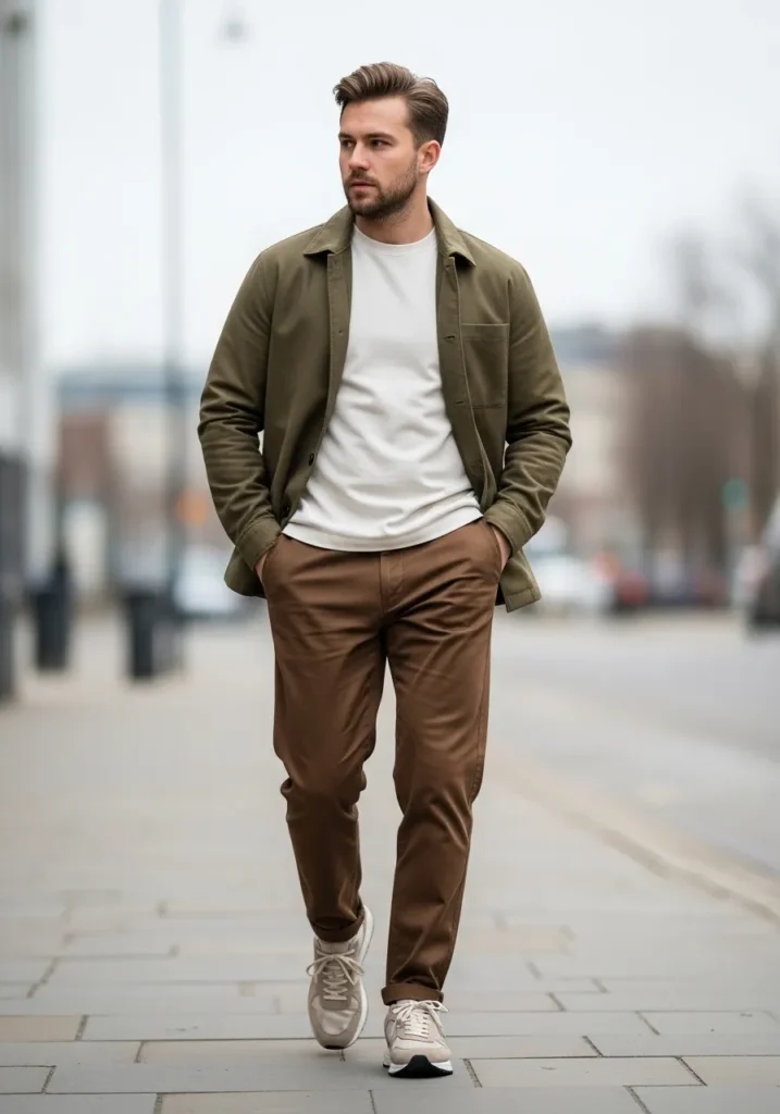 This outfit layers slim brown chinos with a soft off white T shirt and an olive green overshirt that adds depth without feeling heavy. The chinos are neatly tailored with a slight taper, giving the look structure while still keeping it relaxed. Neutral sneakers in a light beige tone keep everything grounded and comfortable. The mix of brown, olive, and cream creates a calm earthy palette that feels very current and easy to wear.