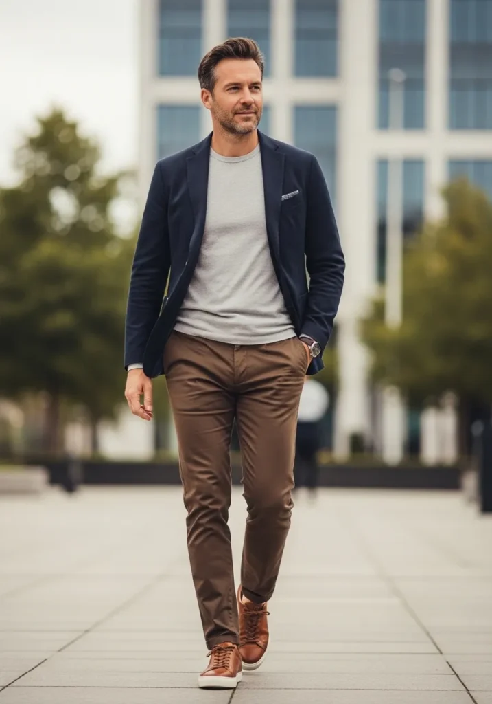 This outfit pairs slim brown chinos with a light gray crew neck T shirt and a tailored navy blazer. The chinos are clean and tapered, giving the legs a sharp line without looking stiff. The blazer adds structure through the shoulders while still feeling relaxed thanks to the simple tee underneath. Brown leather sneakers tie everything together and echo the warmth of the chinos. The whole look feels polished but still easy enough for everyday city life.