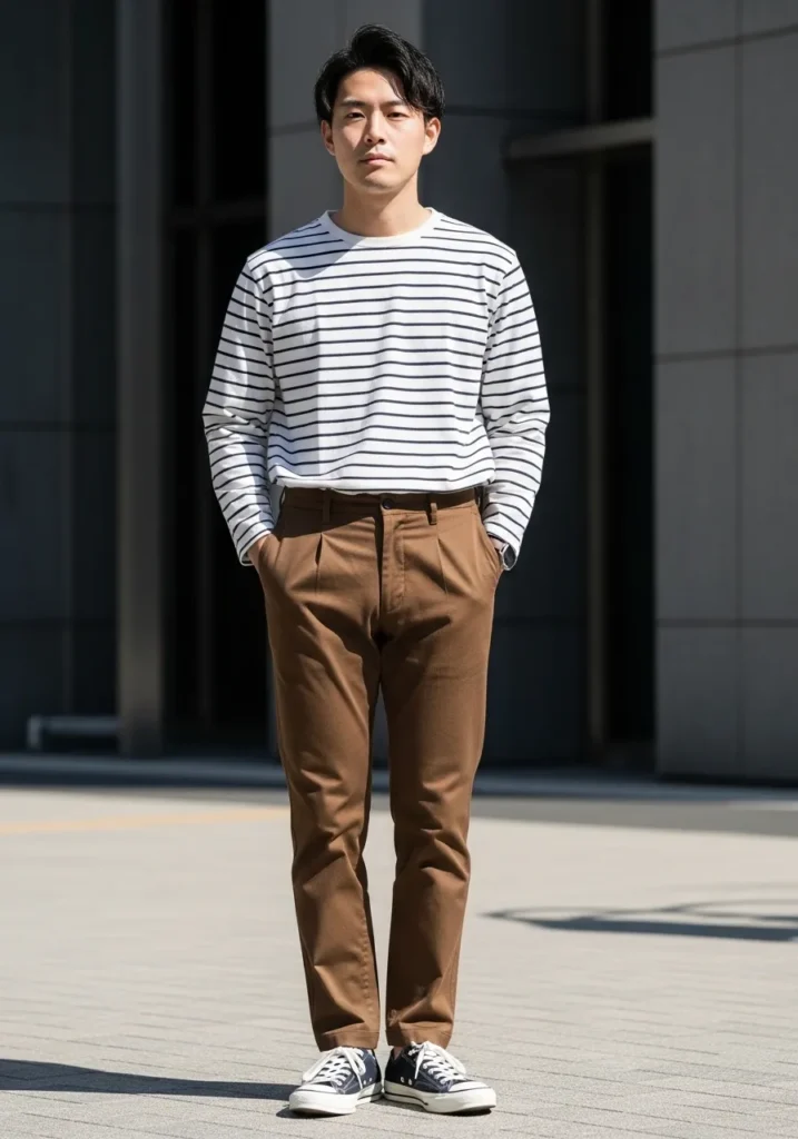 This outfit pairs straight fit brown chinos with a crisp white long sleeve shirt featuring thin black stripes. The chinos have a clean tailored cut with a slightly relaxed leg that feels comfortable but still sharp. The striped top adds a timeless French inspired touch, while black and white canvas sneakers keep the look grounded and casual. The overall vibe feels minimal, modern, and quietly stylish without any extra fuss.