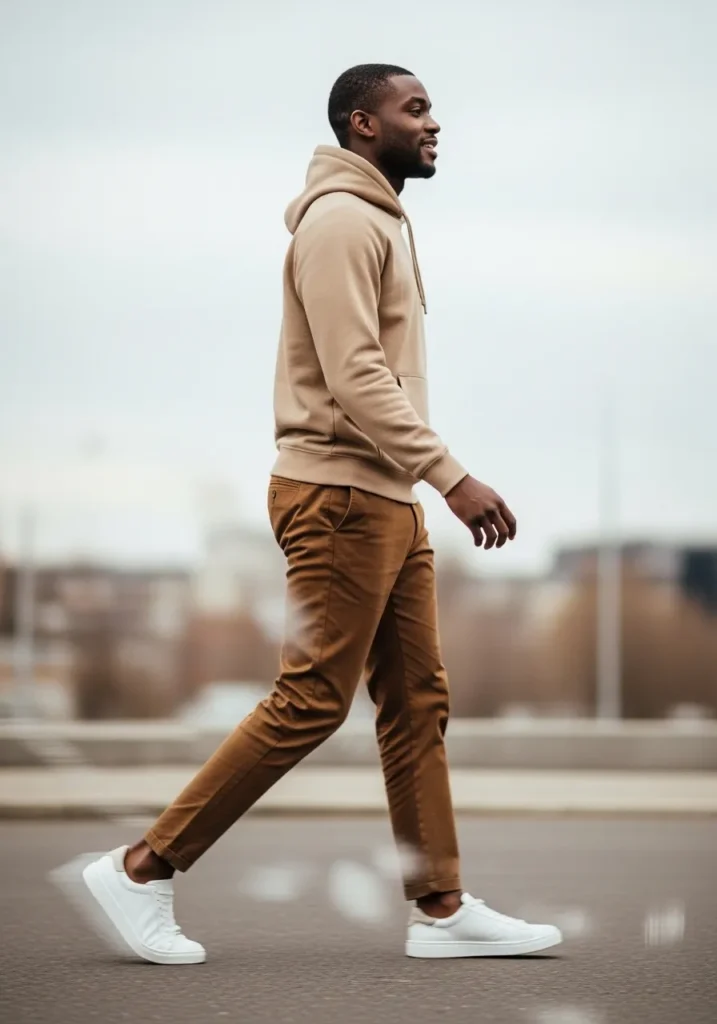 This look pairs slim brown chinos with a soft beige hoodie that feels relaxed and comfortable. The chinos are tailored and slightly cropped at the ankle, giving a clean line that keeps the outfit looking sharp. Crisp white low top sneakers add a fresh contrast and make the whole look feel modern and easy. The mix of warm brown and creamy neutrals creates a laid back palette that still feels intentional and stylish.