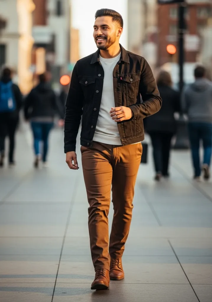 This outfit combines slim brown chinos with a light neutral crew neck and a fitted black denim jacket layered on top. The chinos are tailored and smooth, giving a clean silhouette that contrasts nicely with the structured jacket. Brown leather lace up boots add depth and keep the palette warm and cohesive. The mix of dark black, soft neutral, and rich brown creates a sharp city look that feels confident and current.