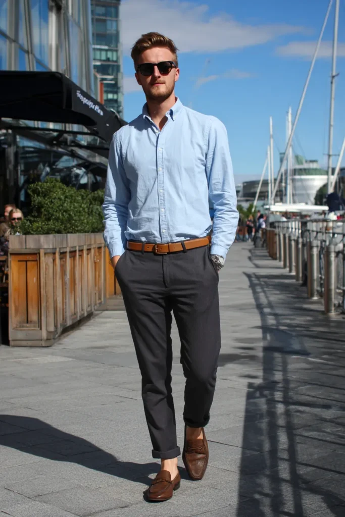 This outfit is the perfect mix of relaxed and polished for a daytime birthday celebration, especially one near the water like in the picture. He’s rocking a light blue, long-sleeved button-down shirt that looks like a breathable linen or a light cotton, which is neatly tucked into a pair of dark gray trousers cuffed just above the ankle. The whole look is cinched together with a warm, cognac-brown leather belt that perfectly matches his classic brown leather driving loafers, adding a touch of sophisticated leisure to the overall ensemble.