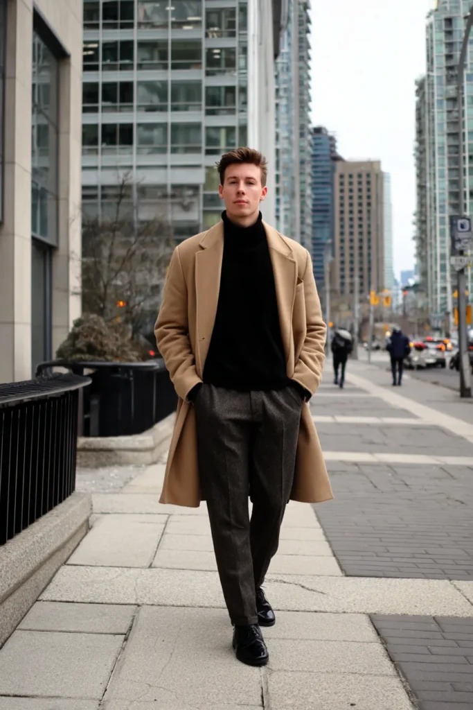 This is seriously such a polished and sophisticated look that is absolutely perfect for a celebratory birthday dinner or a smart event in cooler weather. He is rocking a luxurious camel-colored overcoat with clean lines, worn open to reveal a sleek black turtleneck sweater underneath. The lower half features well-tailored trousers in a dark charcoal or brown tweed or subtle patterned fabric, finished off with highly polished black leather dress shoes for a truly refined aesthetic.