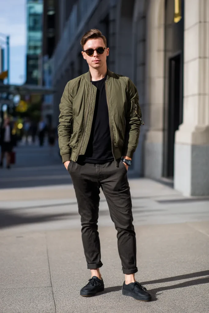 This cool outfit is seriously perfect for a casual yet stylish birthday outing, like grabbing a celebratory lunch or hitting a cool urban spot. He’s rocking a sharp olive green bomber jacket, which has that great, slightly structured look and cool zip pocket detailing on the sleeve, layered over a simple black crewneck t-shirt. This monochromatic base continues with dark olive or black chinos that are smartly cuffed at the ankle, finished off with matching all-black sneakers for a sleek, cohesive finish.
