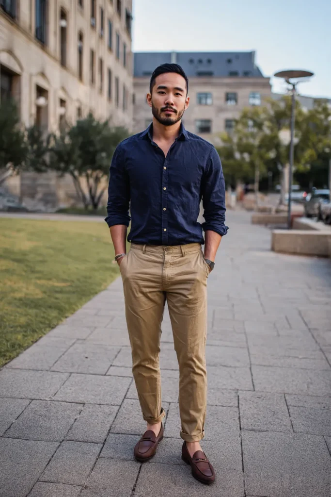 This sharp outfit is totally amazing for a warm-weather birthday celebration, whether you’re at a seaside café or a chic city brunch. He’s rocking a fantastic dark navy blue linen shirt, left unbuttoned slightly at the collar and sleeves rolled up, which is perfectly tucked into a pair of crisp, light cream or off-white chinos. The whole vibe is completed with warm, cognac-brown leather loafers, adding a rich, classic touch that makes the look feel incredibly upscale and vacation-ready.