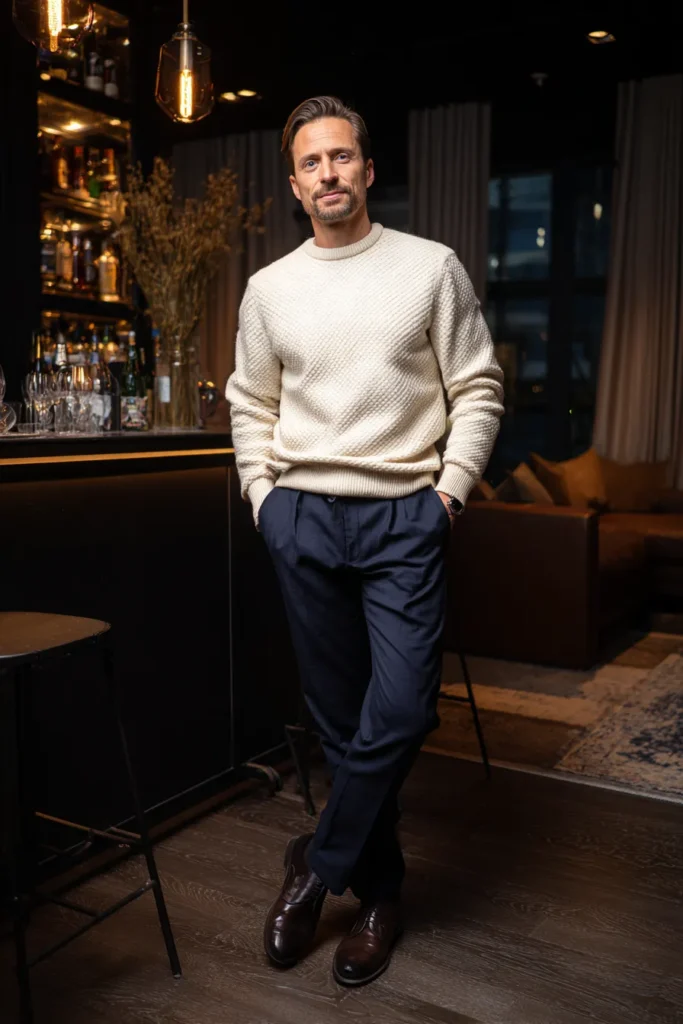This sophisticated look is perfect for a chic evening birthday dinner or a cocktail hour in a dimly lit bar, striking a beautiful balance between comfort and elegance. He’s wearing a gorgeous cream or off-white crewneck sweater featuring a noticeable textured weave, maybe a waffle knit or similar, that makes it look super cozy. This is paired with tailored, deep navy blue or almost black pleated trousers and finished off with shiny, dark brown leather dress shoes.