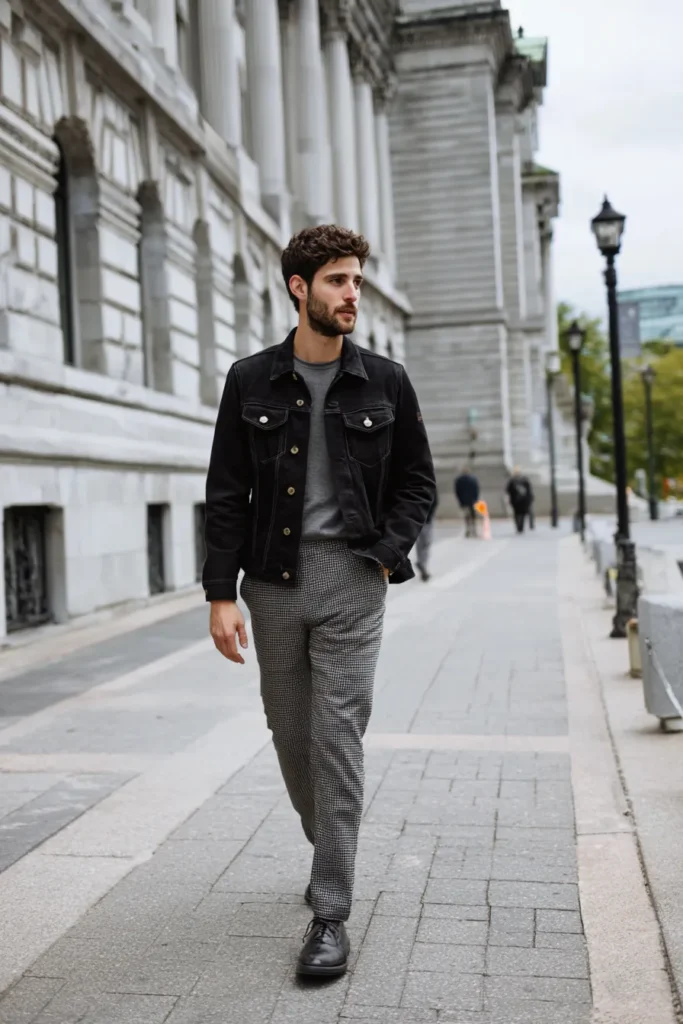 This outfit is a brilliant choice for a stylish, slightly edgy birthday celebration, like drinks at a cool bar or dinner in a trendy neighborhood. He’s wearing a sharp black denim jacket, possibly with some visible stitching or metal buttons, layered over a simple grey crewneck t-shirt. The real statement comes from the lower half with tailored trousers in a gray and white houndstooth or subtle plaid pattern, which are finished with polished black lace-up shoes, blending casual and formal elements perfectly.