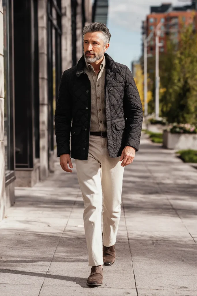 This cozy and structured outfit is fantastic for a cooler weather birthday, like a crisp fall afternoon lunch or an evening celebration where he needs an extra layer. He’s wearing a stylish black quilted jacket, which looks great over a button-down shirt in a soft, textured tan or oatmeal color. This warm layered top half is paired with comfortable, light cream or off-white chinos and finished off with dark brown suede slip-on shoes, creating a refined yet rugged outdoor vibe.