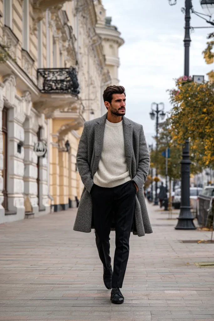 This outfit is absolutely gorgeous for a stylish, chilly weather birthday celebration, like a classy dinner or an afternoon event in a colder climate. He’s wearing a beautiful, textured dark gray tweed or herringbone overcoat that provides incredible structure and warmth, layered over a cozy, light oatmeal or cream-colored crewneck sweater. This sophisticated top half is paired with sharp black tailored trousers and finished off with shiny black leather dress shoes, giving the whole look a refined, European elegance.