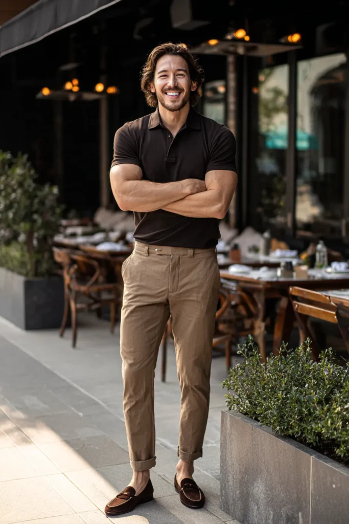 This sharp, slightly vintage-inspired outfit is fabulous for an outdoor terrace birthday brunch or a nice casual dinner in a warm climate. He’s wearing a fitted short-sleeved polo shirt in a deep, rich espresso brown or black, tucked into impeccably tailored tan or camel-colored chinos. The trousers are subtly cuffed at the ankle, showing off a pair of gorgeous dark brown suede loafers, giving the whole look a polished Mediterranean vacation feel.