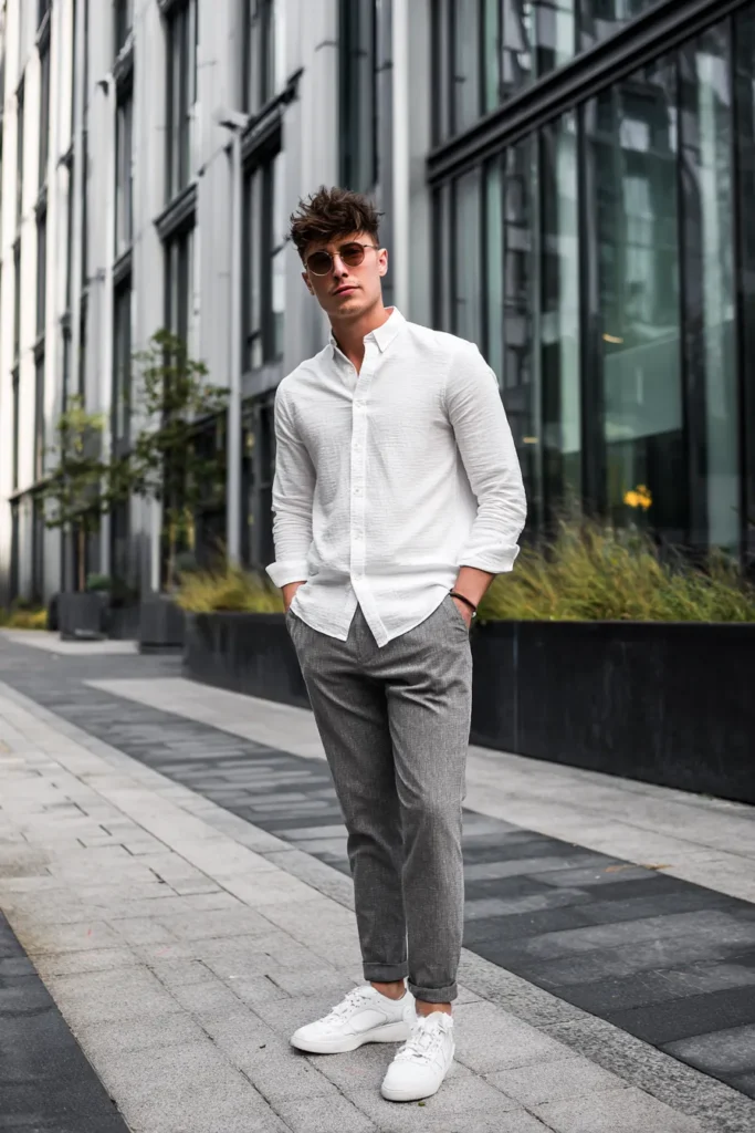 This look is absolutely perfect for a contemporary birthday celebration, maybe a gallery visit followed by drinks, and it just screams clean, modern sophistication. He’s wearing a slightly textured white button-down shirt, maybe a crisp cotton or linen blend, with the sleeves rolled up for a relaxed vibe, paired with beautifully fitted light grey melange trousers. The outfit is grounded by a pair of pristine white leather sneakers, creating a sharp, high-contrast effect that looks incredibly fresh.