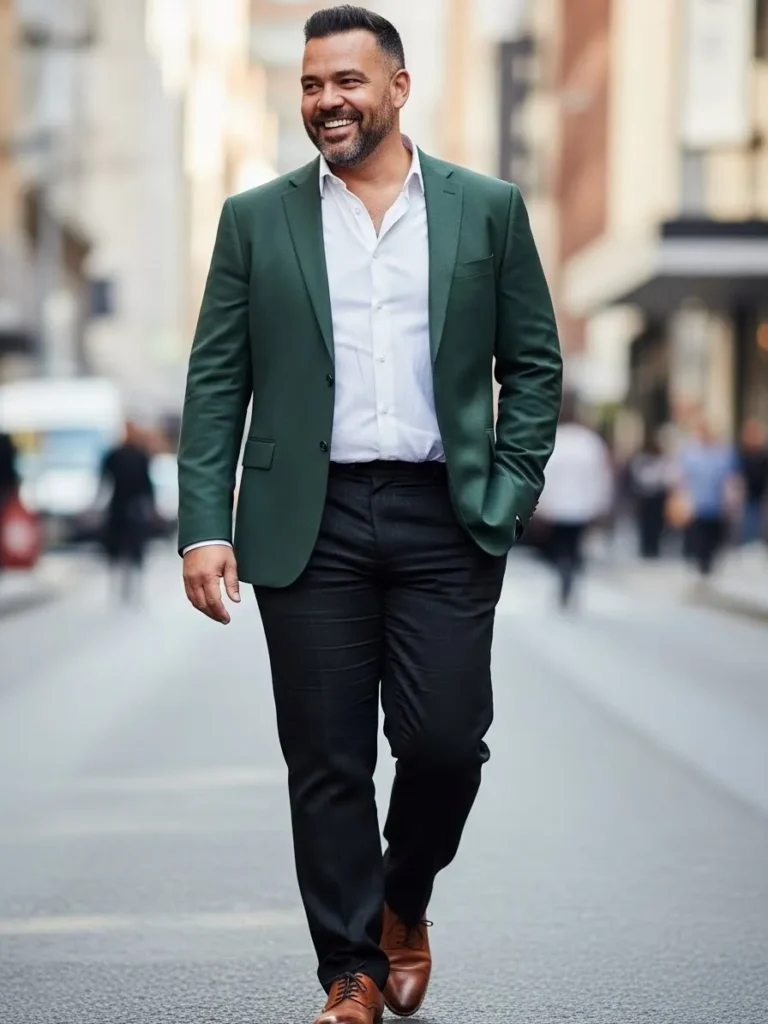 This outfit features a deep green blazer worn over a crisp white shirt and dark trousers.