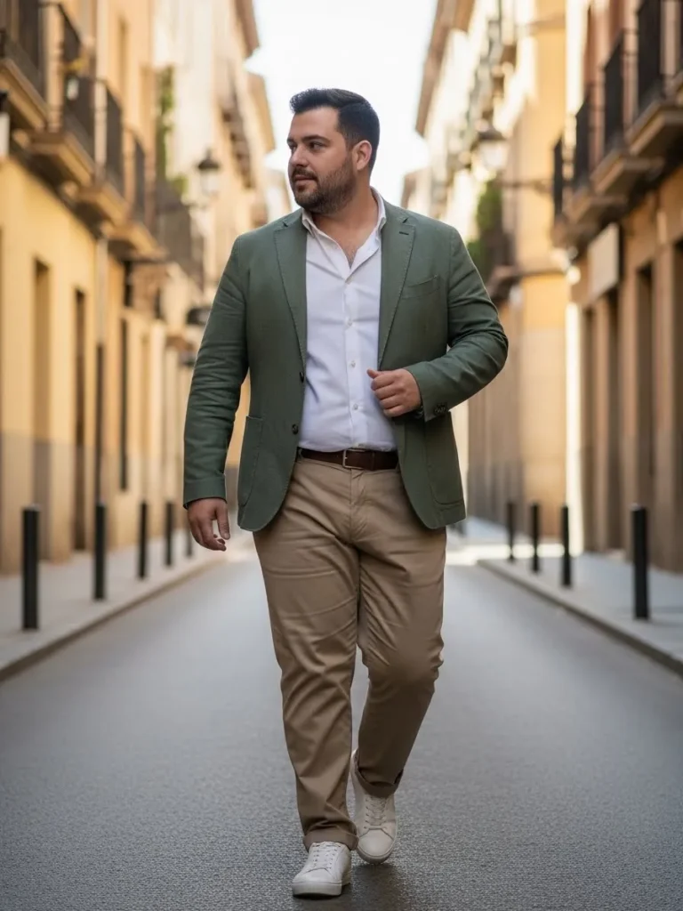 This look combines an olive green blazer with a white shirt and tan trousers for a fresh semi formal palette.