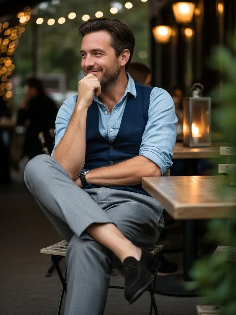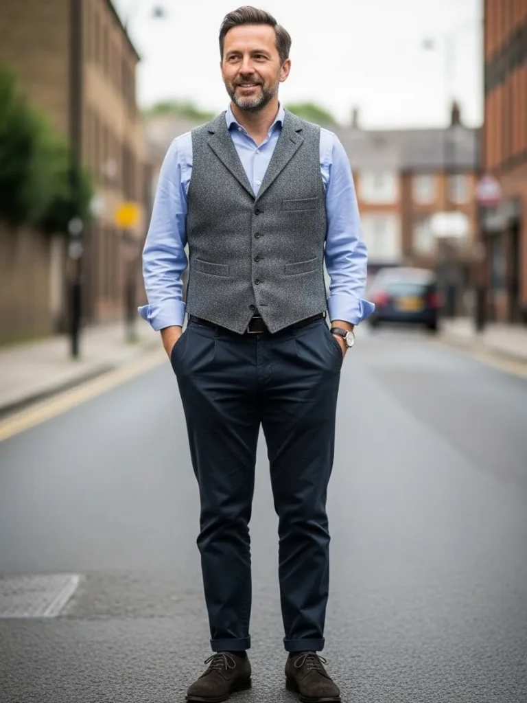 The blue shirt softens the vest, and the slim trousers keep everything sharp, which makes it one of those looks that just works anywhere.