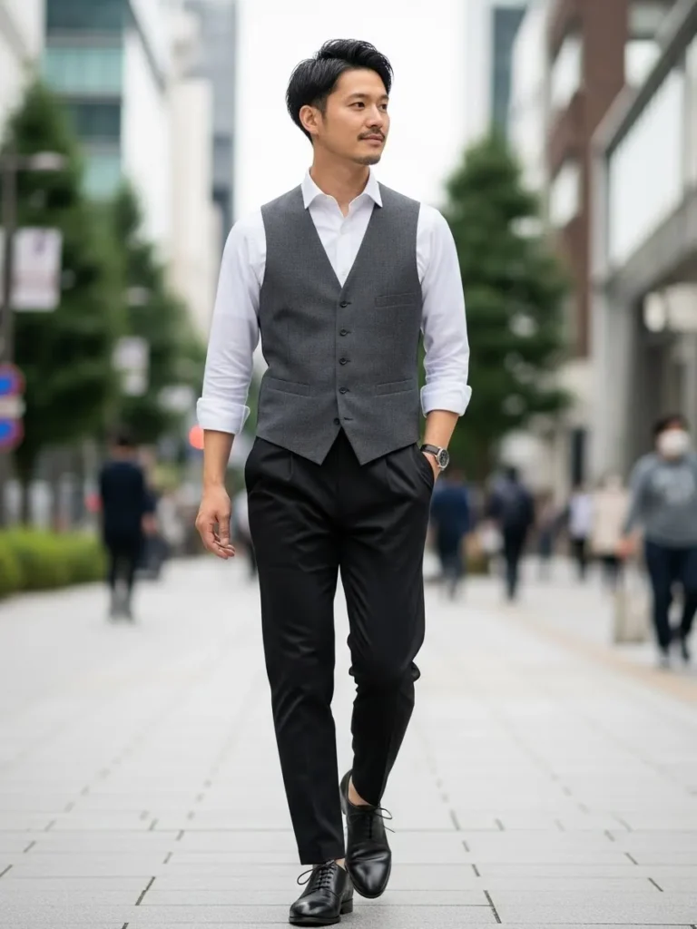 This outfit features a charcoal vest layered over a bright white shirt and paired with slim dark trousers and classic shoes.