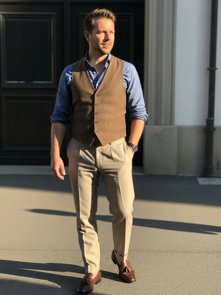 A warm beige vest is layered over a blue shirt and paired with light tailored trousers and brown shoes.