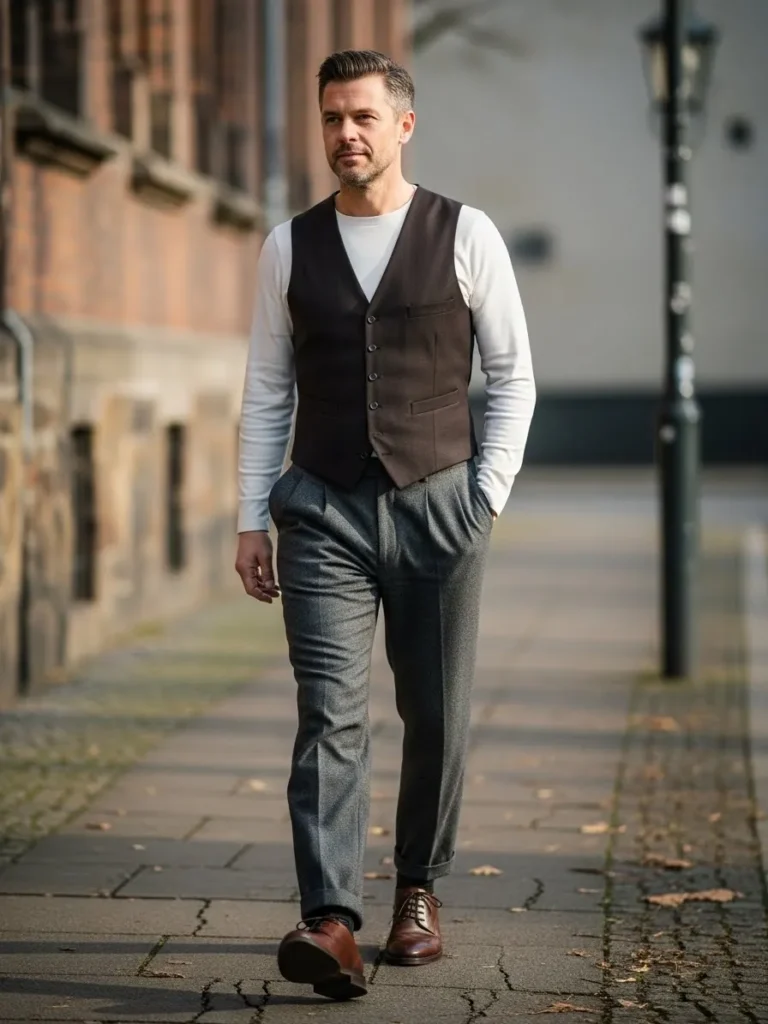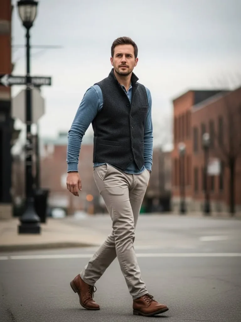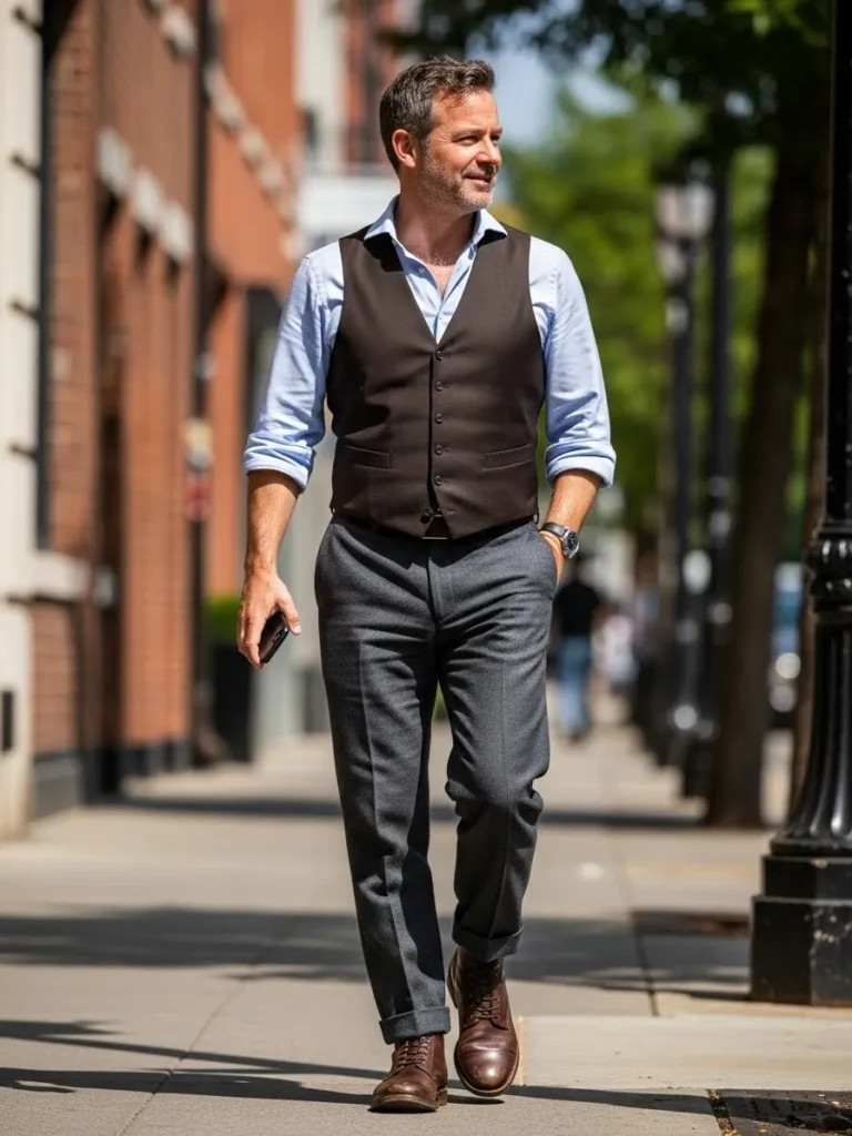This outfit features a brown vest over a light blue shirt with rolled sleeves, styled with gray trousers and leather shoes.