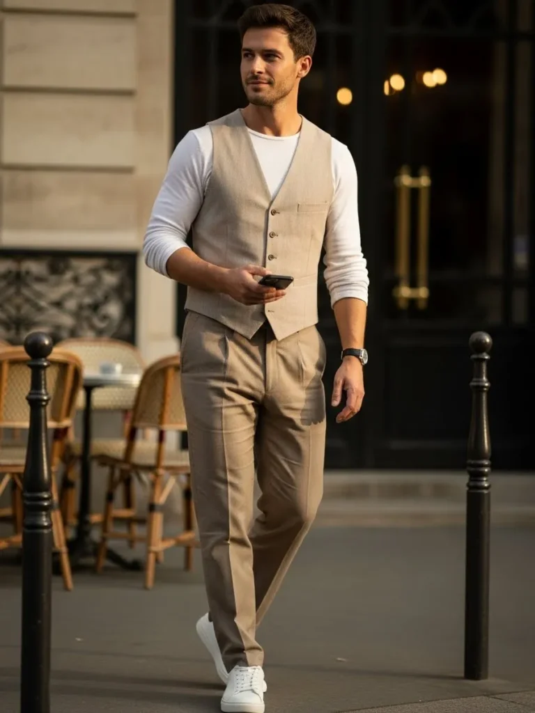 A light beige vest is layered over a soft neutral top and matched with tan trousers and clean white sneakers.