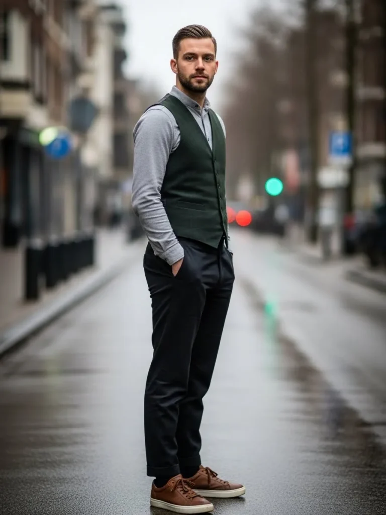 This outfit features a dark green vest layered over a light shirt, paired with slim black trousers and brown leather shoes.