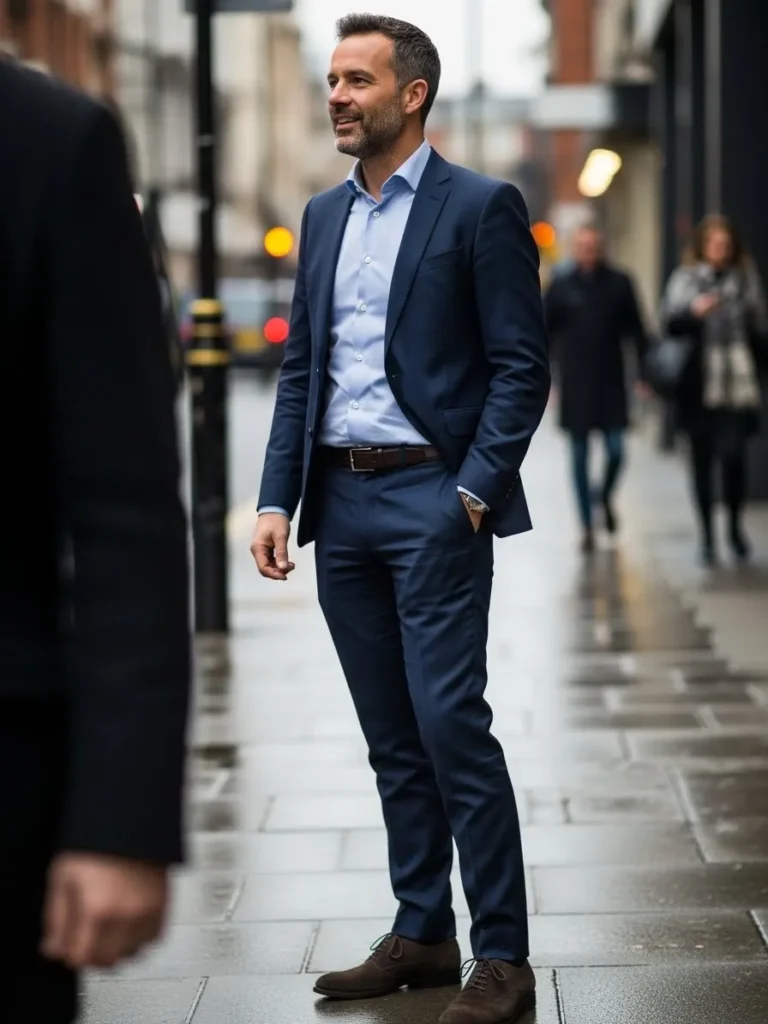 This tailored blue suit is styled with a light shirt and brown shoes for a timeless semi formal look. The fit is clean and comfortable, and the overall styling feels very natural and grounded. It has an easy elegance that works in almost any setting.