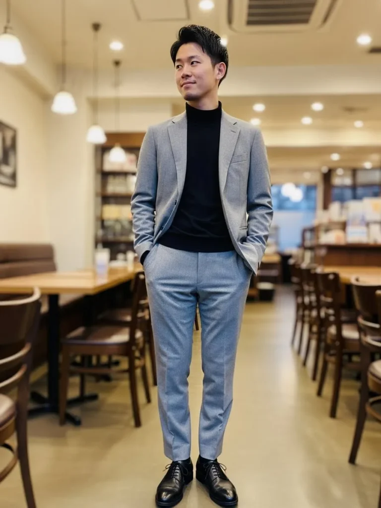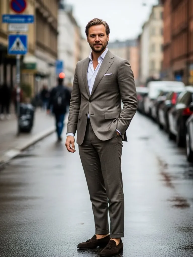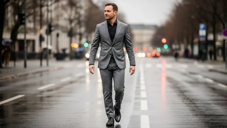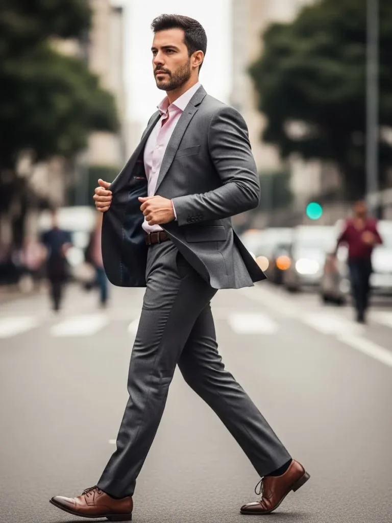 This gray tailored suit is styled with a crisp shirt and classic leather shoes, creating a clean and confident silhouette. The fit is sleek without looking stiff, and the subtle fabric creases add to the natural movement of the look. It feels very modern and city ready.