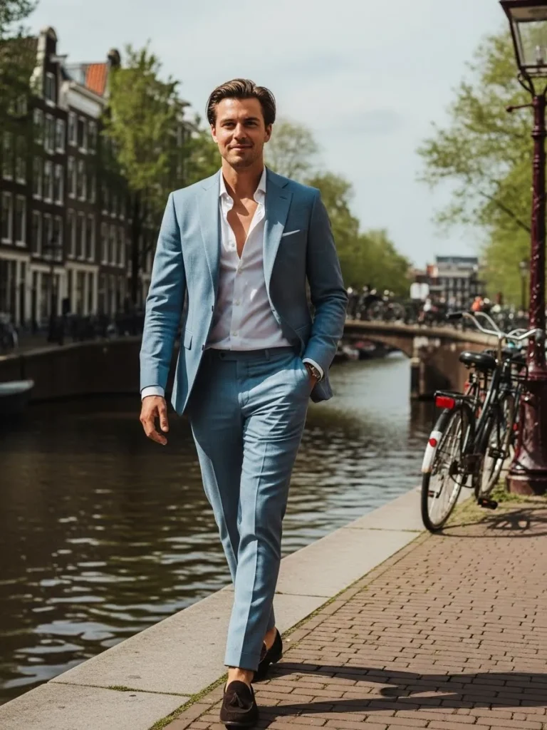 This light blue tailored suit paired with an open white shirt feels fresh and relaxed, especially with the waterfront backdrop. The fabric looks lightweight and breathable, perfect for warmer days, while the neutral shoes keep things clean and cohesive. The whole outfit feels calm and confident.