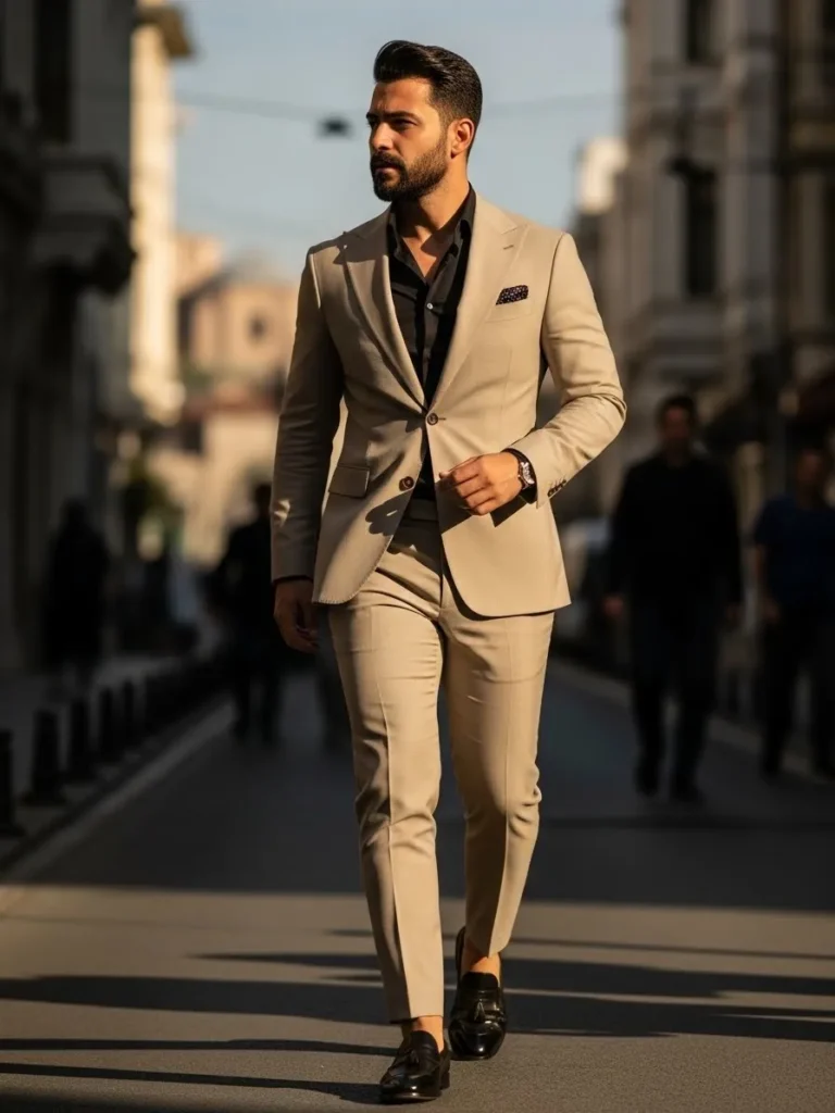 This beige tailored suit is paired with a darker shirt, creating a striking contrast that feels modern and intentional. The slim fit and clean lines give it a sharp silhouette, while the warm tone of the suit keeps it relaxed. The styling feels confident and fashion forward.