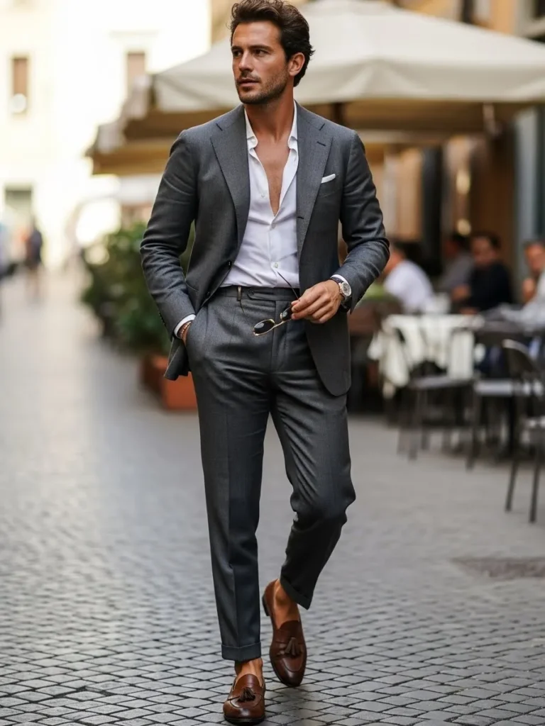 This gray tailored suit is styled with an open collar white shirt for a relaxed yet polished vibe. The trousers and jacket move naturally as he walks, and the brown shoes add warmth to the neutral palette. The café setting makes the look feel lived in and effortless.