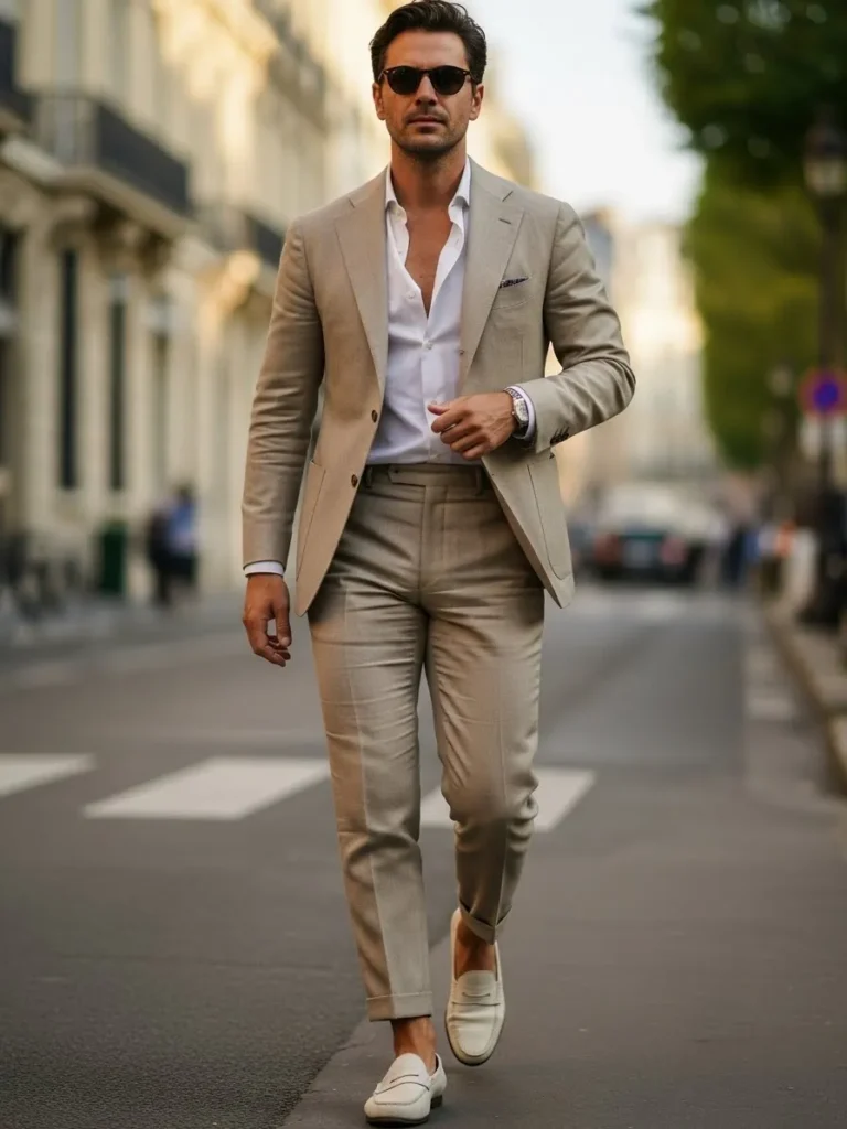 This beige tailored suit leans into a lighter, more relaxed aesthetic with an open white shirt and soft neutral tones. The fabric looks breathable and easy, and the light shoes keep the whole outfit feeling airy and warm weather ready. It has that confident walk down the street vibe that feels very natural.