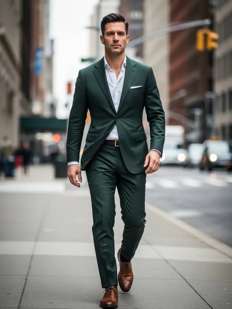 This outfit showcases a deep green tailored suit paired with a crisp white shirt for a bold yet refined look. The structured jacket and slim trousers create a clean silhouette, while the brown leather shoes add warmth and depth. It feels confident and striking without being loud.