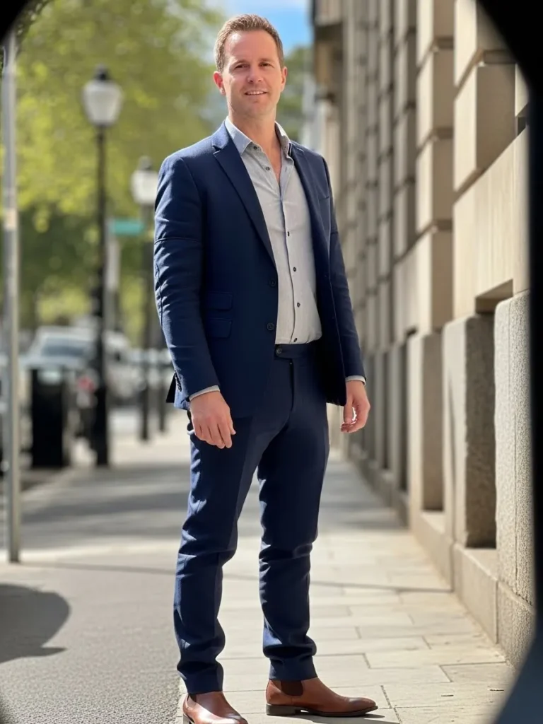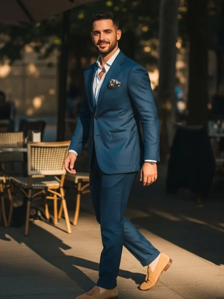 This tailored blue suit has a slightly richer tone that feels perfect for late afternoon or evening settings. Styled with a light shirt and classic leather shoes, the outfit feels smooth and cohesive. The clean lines and fitted cut give it a timeless appeal with a modern finish.