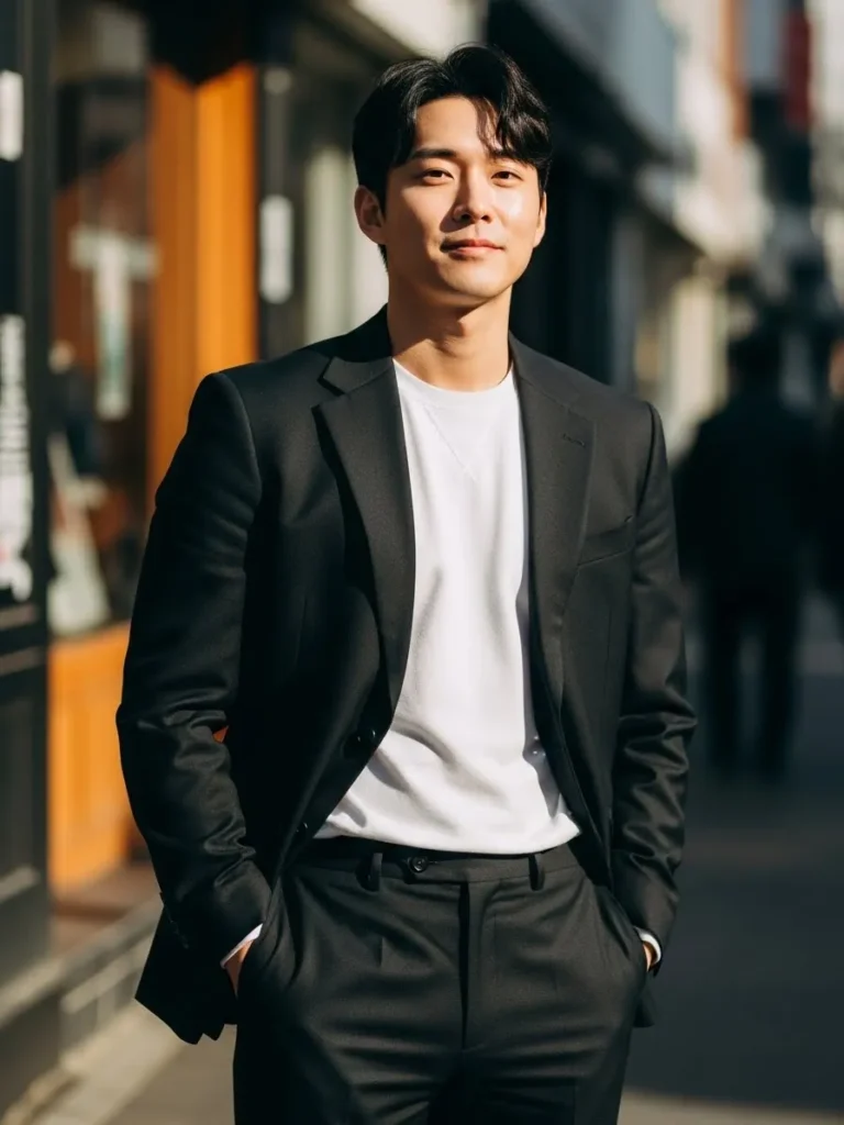 This look features a black tailored suit worn with a simple white T shirt for a clean and modern contrast. The relaxed styling keeps it approachable while the suit maintains structure and polish. It feels contemporary, cool, and very current.
