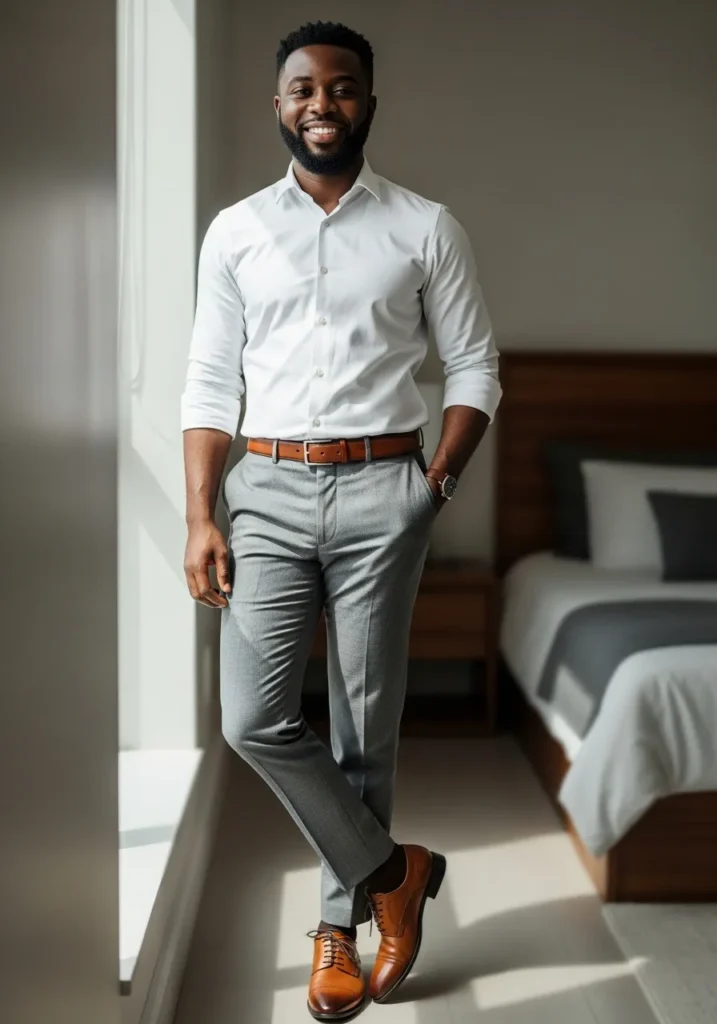 This look features a crisp white button down shirt styled with light gray trousers and warm brown shoes. The fit is clean and classic, giving the outfit a sharp but relaxed appearance.