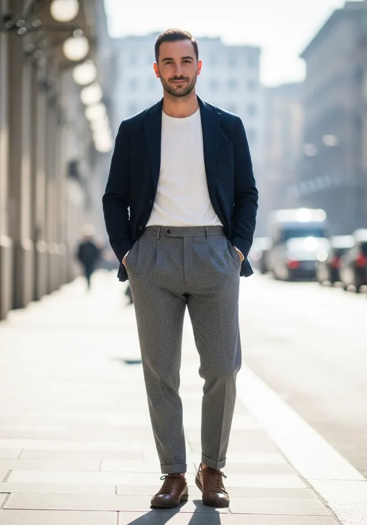 This outfit combines a navy blazer with a clean white tee and tailored gray pants, finished with brown leather shoes. The contrast between the structured blazer and the casual tee creates a relaxed but polished balance that feels modern and easy to wear.