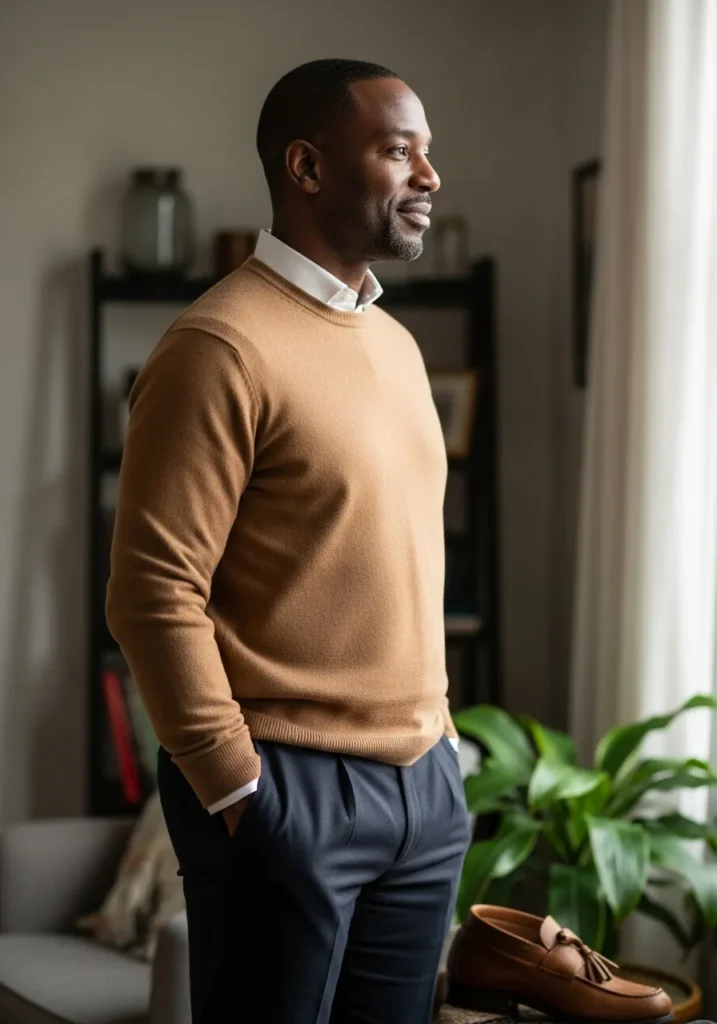 Here we see a warm camel sweater styled with dark tailored trousers and classic leather shoes. The soft knit texture pairs beautifully with the clean lines of the pants, creating a calm and refined look.