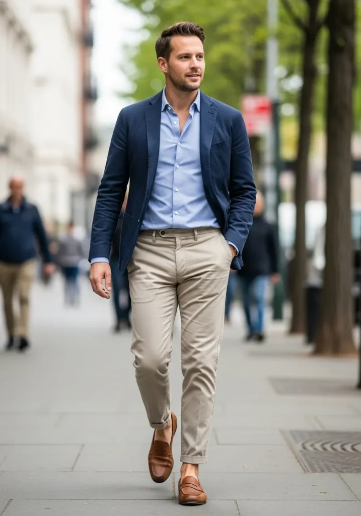 This look features a blue button down shirt styled with beige pants and a structured blazer, finished with brown leather shoes. The colors feel clean and balanced, creating a sharp but relaxed appearance.