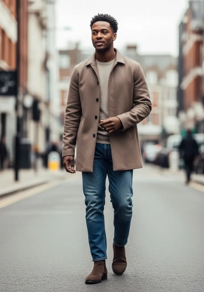 This look features a tailored brown coat layered over a simple knit top and classic blue jeans, finished with dark suede shoes for a refined touch. The mix of structured outerwear and everyday denim gives the outfit a clean balance that works well across seasons.