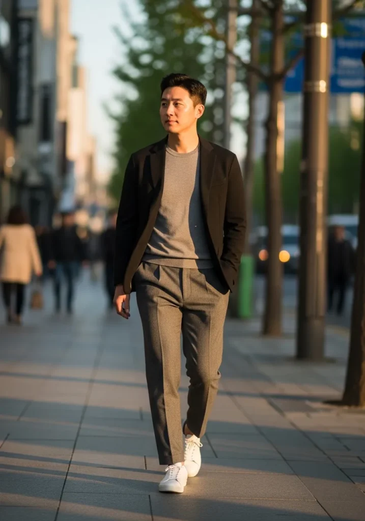 This outfit pairs a light gray knit sweater with slim black trousers and clean white sneakers, creating a relaxed but polished look that feels calm and modern. The soft texture of the sweater balances nicely with the structured pants, while the neutral color palette keeps everything timeless and easy to wear for a casual business setting.