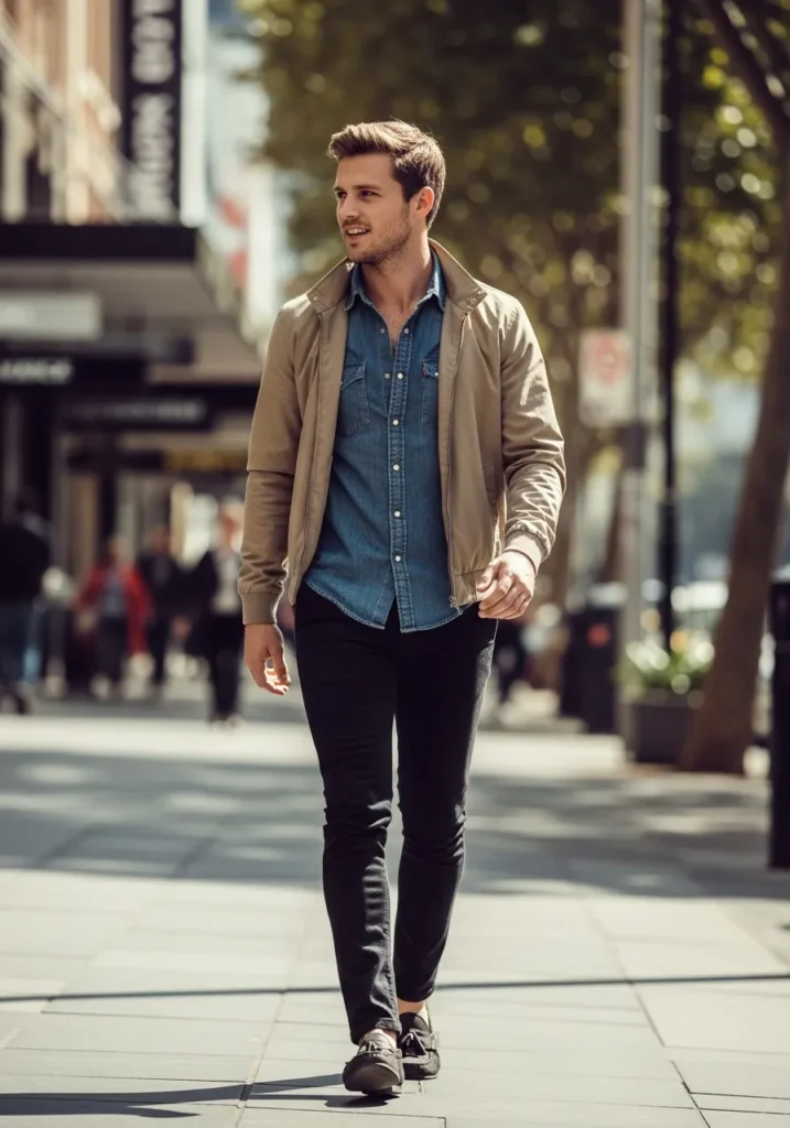 This look features a button down shirt layered under a lightweight jacket with slim dark pants, blending relaxed textures with clean structure. The overall vibe feels practical and polished, making it ideal for everyday business casual wear.