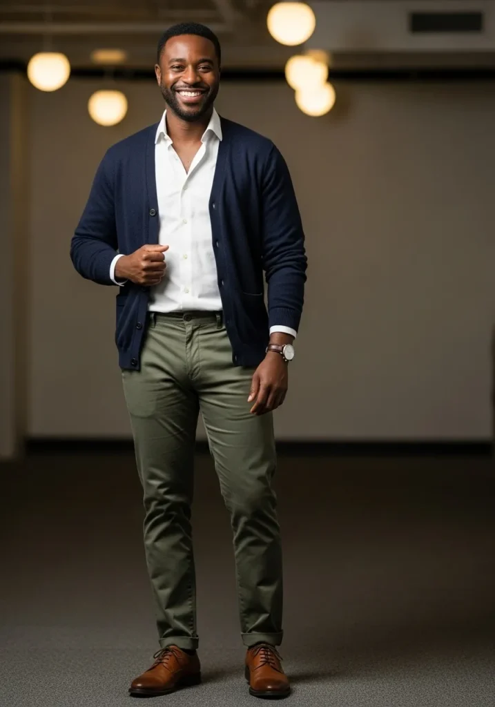 This outfit features a navy cardigan layered over a crisp white button down shirt, paired with olive green trousers and brown leather shoes. The colors feel classic and grounded, while the relaxed cardigan softens the look and keeps it comfortable for everyday wear.