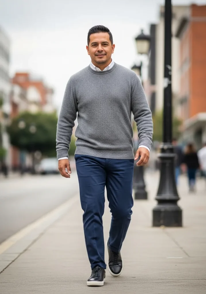Here we see a light gray sweater styled with tailored blue trousers and casual sneakers. The combination feels clean and simple, with neutral tones that make the outfit easy to wear across different seasons.