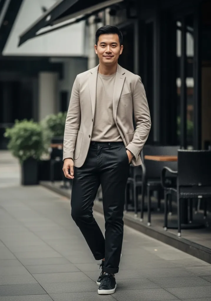 Here we see a dark casual jacket paired with a soft neutral top and matching trousers, finished with clean white sneakers. Everything flows together smoothly, creating a minimal look that feels modern and intentional.