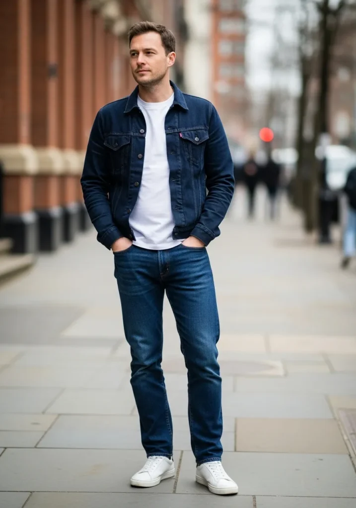 This outfit features a dark blue denim jacket layered over a crisp white T shirt, paired with straight leg blue jeans and clean white sneakers. The fit looks relaxed but intentional, with classic denim textures and a simple color palette that feels easy and familiar.