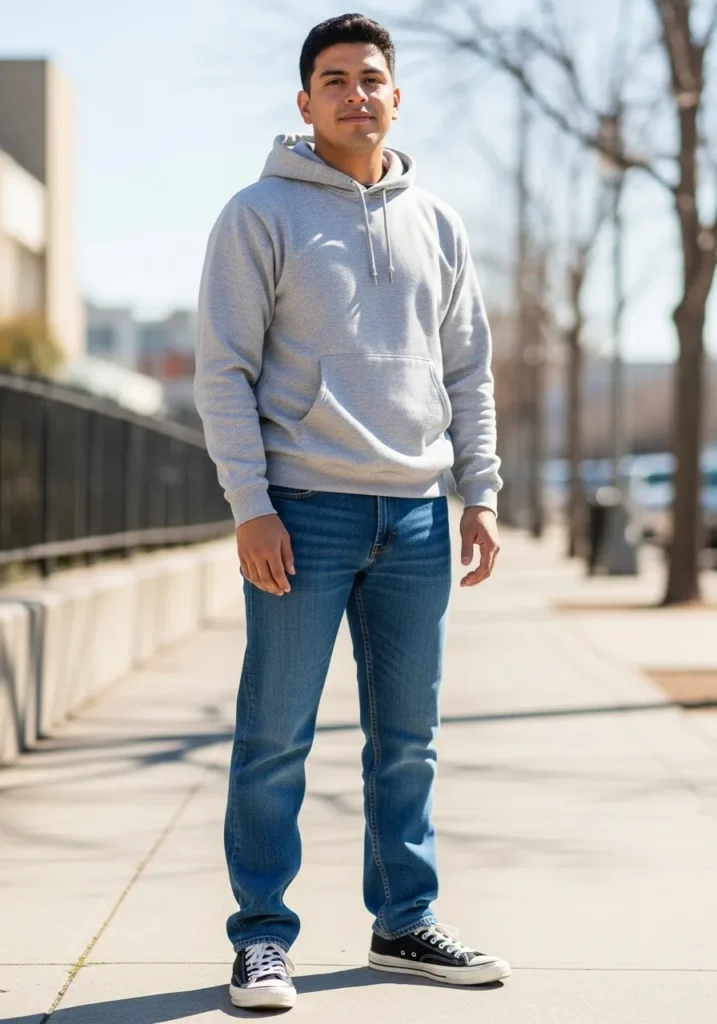 This outfit pairs a light hoodie with blue jeans and casual sneakers. The fit is relaxed and comfortable, perfect for an easy day out.